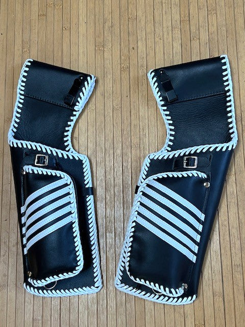 The 17 inch length of this Deluxe Field quiver is made of Genuine fine leather. The accessory pouch is also leather. It comes with a leather belt that adjusts between 30 and 38 inches. It will also accept your personal belt up to 1 1/2 inches.